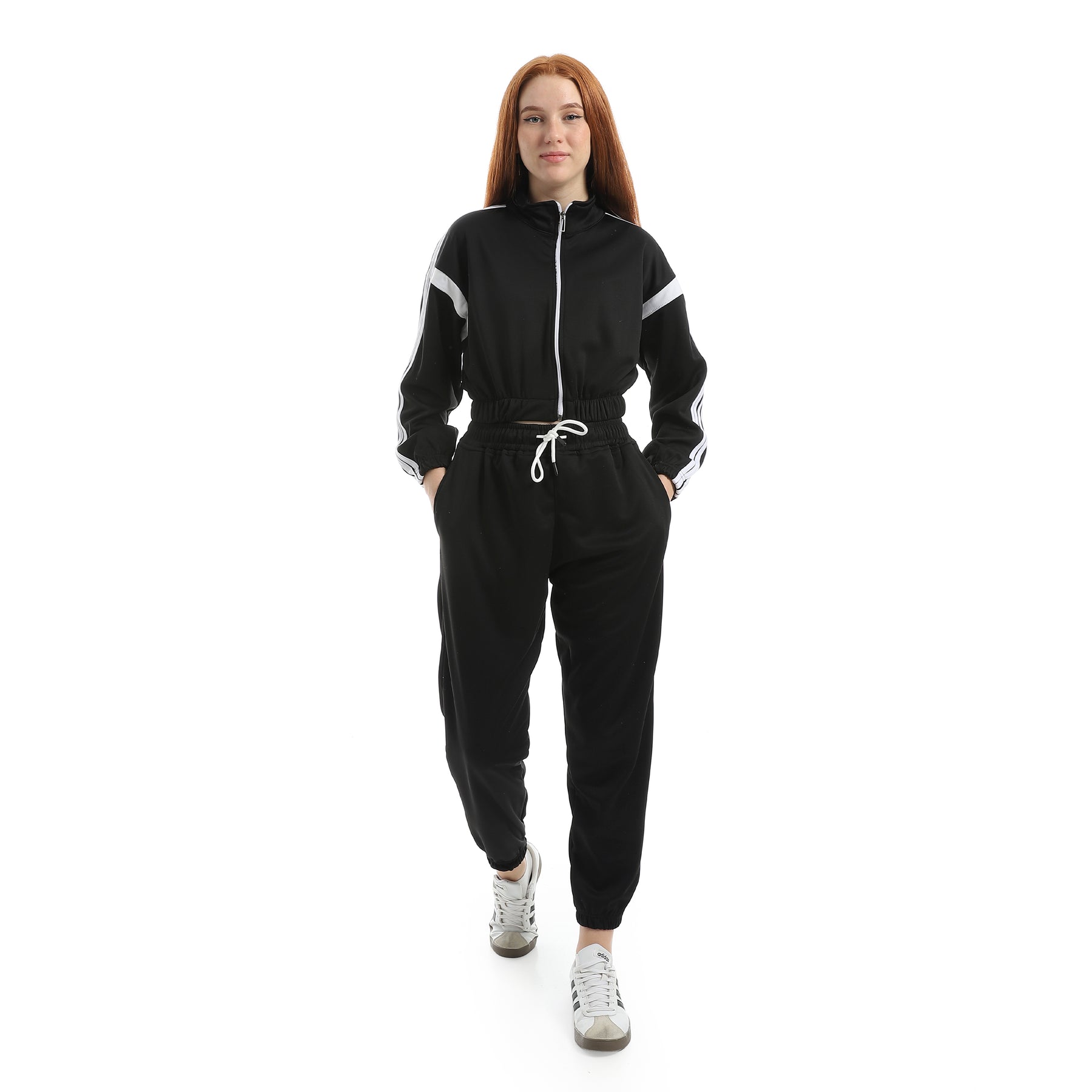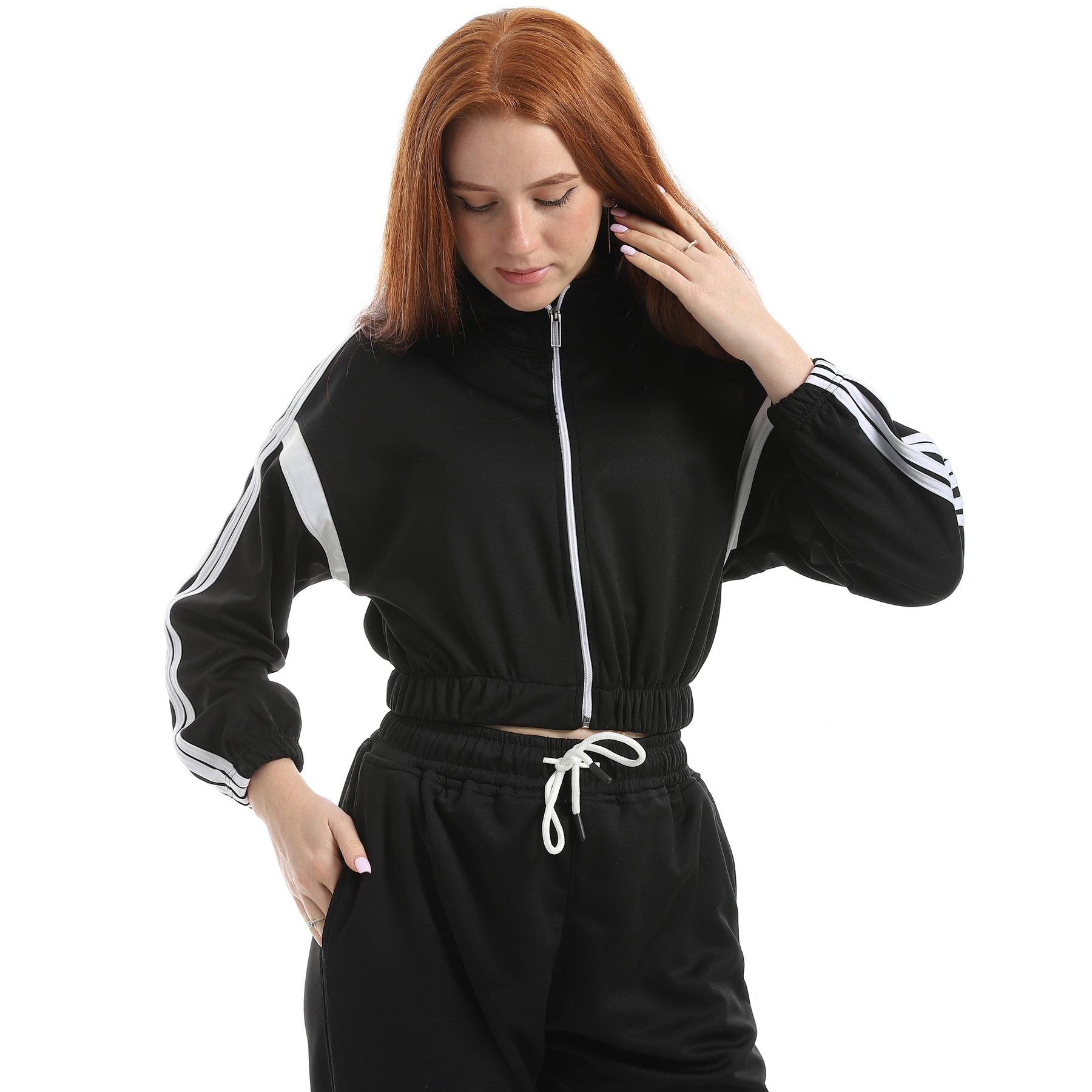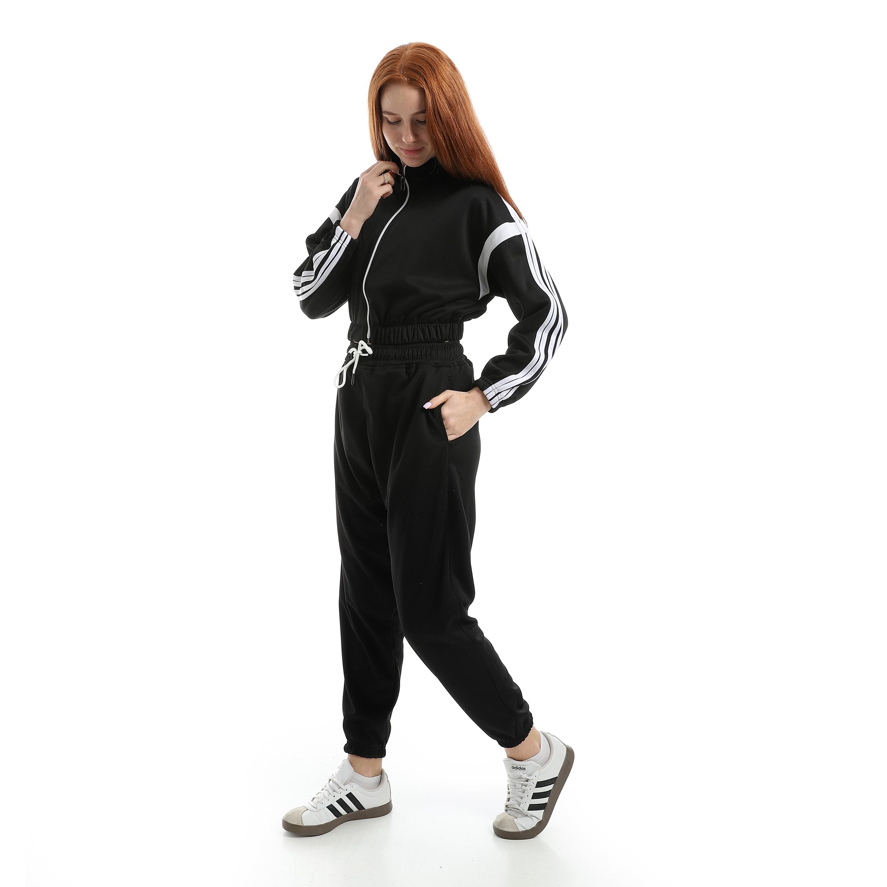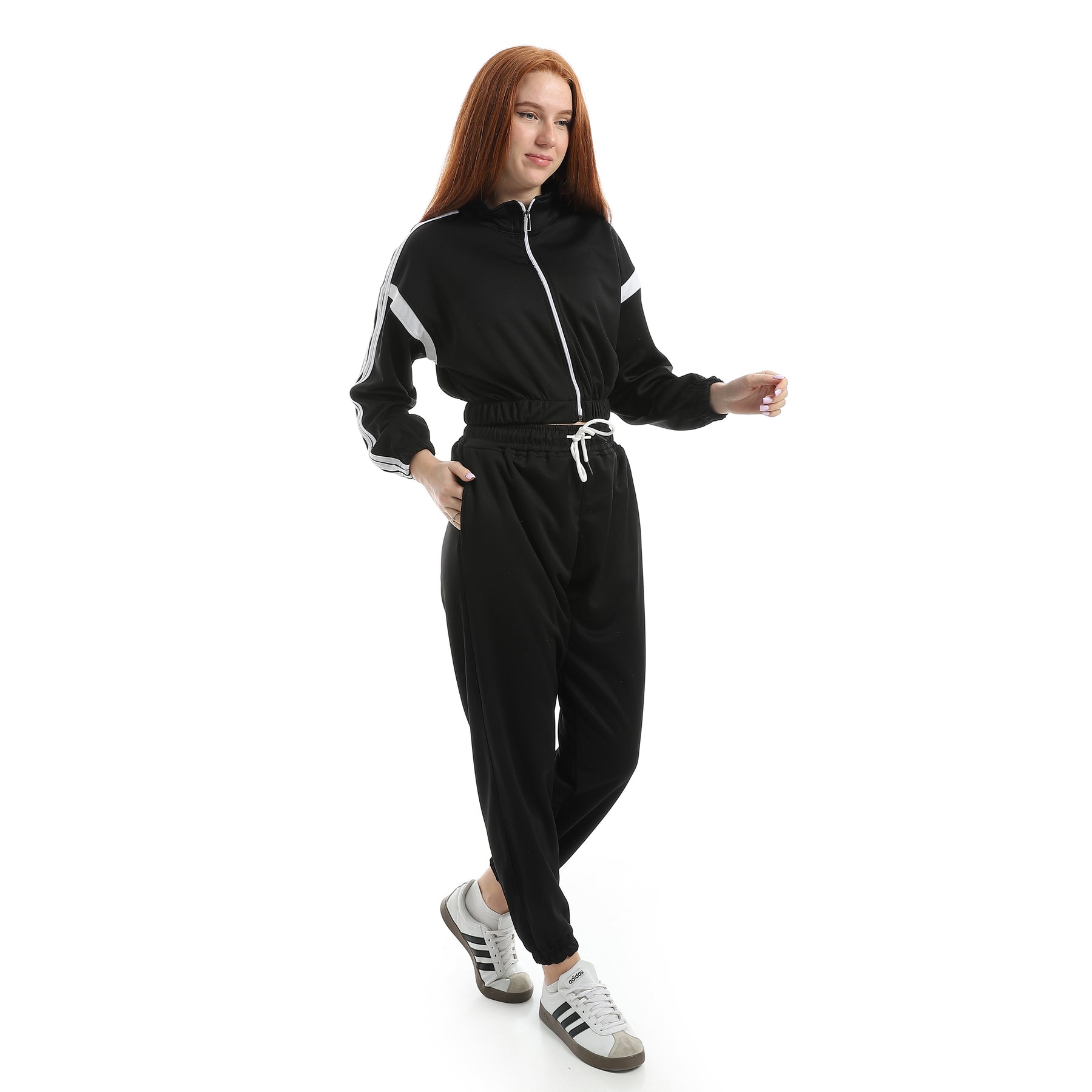 Women's sports tracksuit, sporty fabric, with 4 stripes on the sleeves