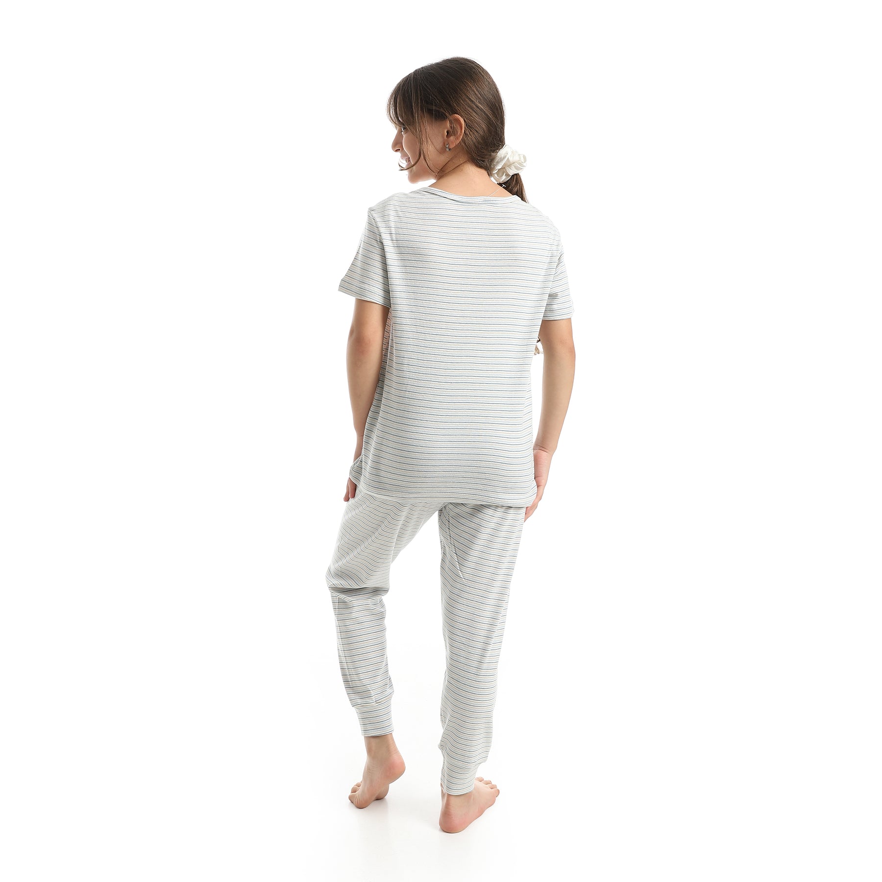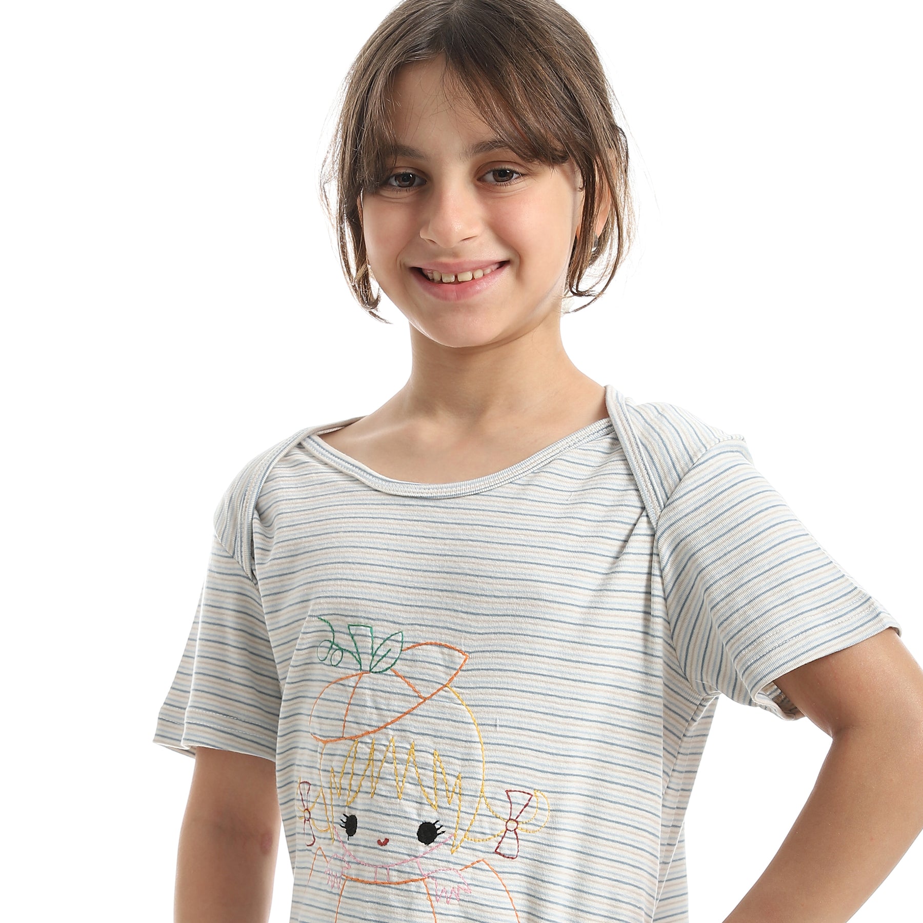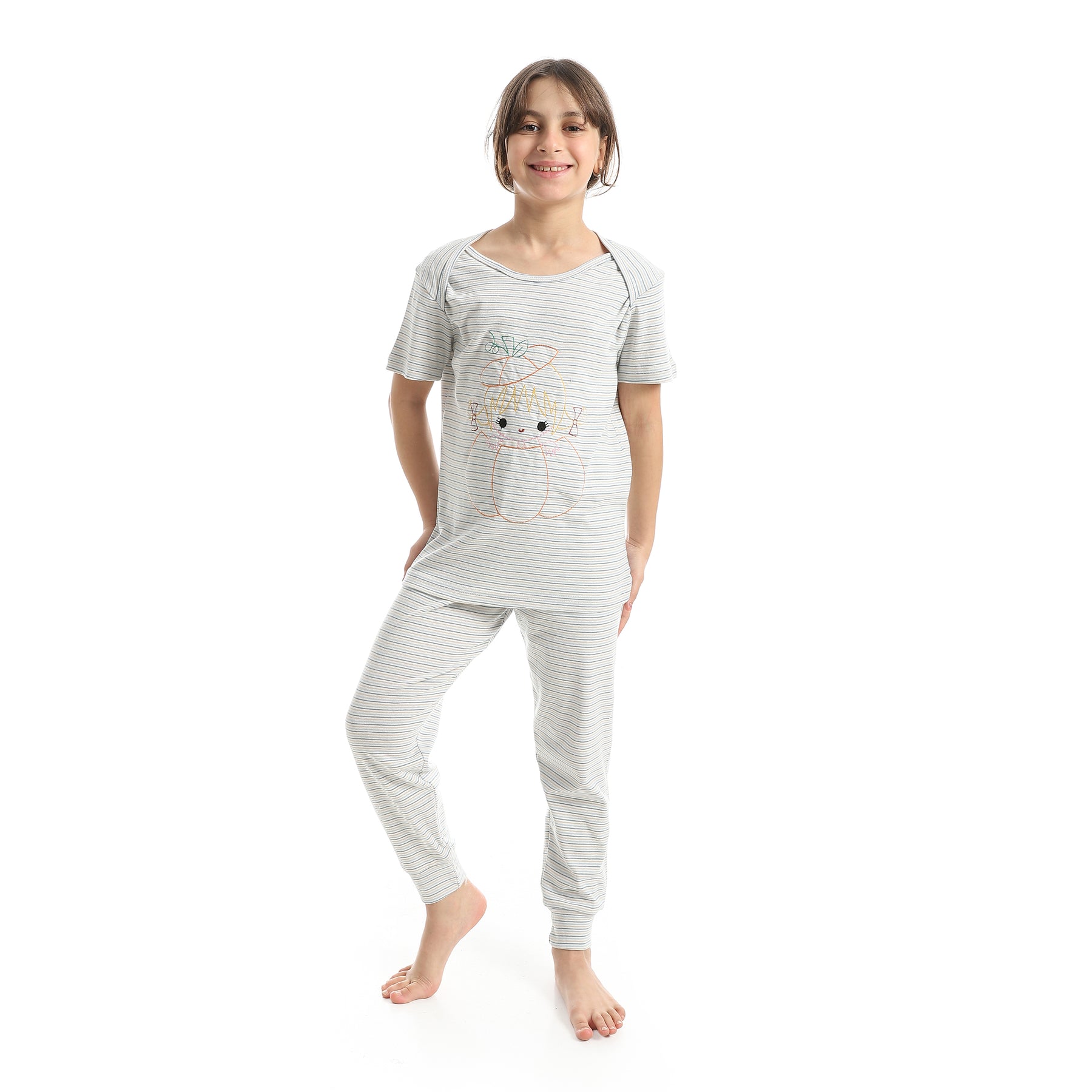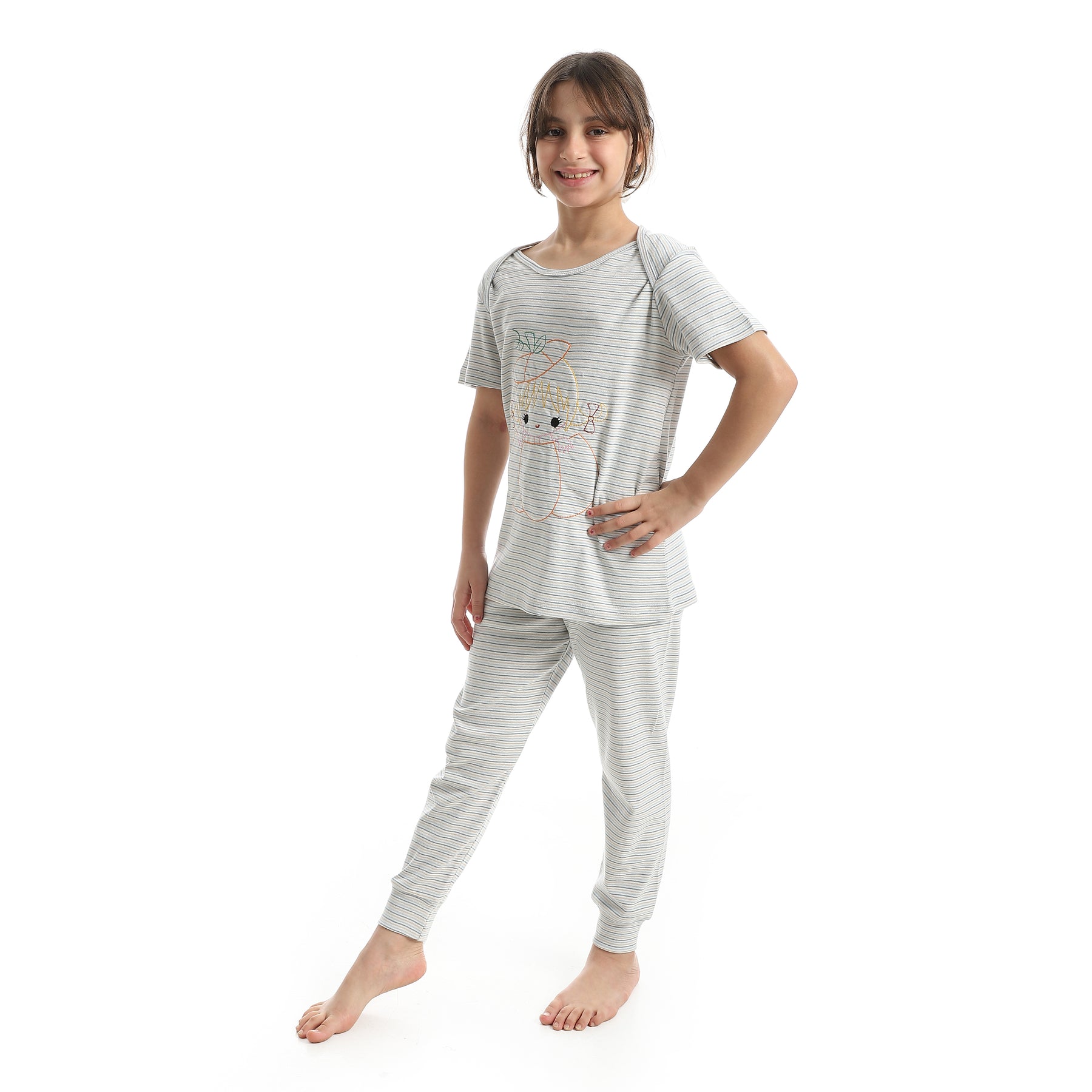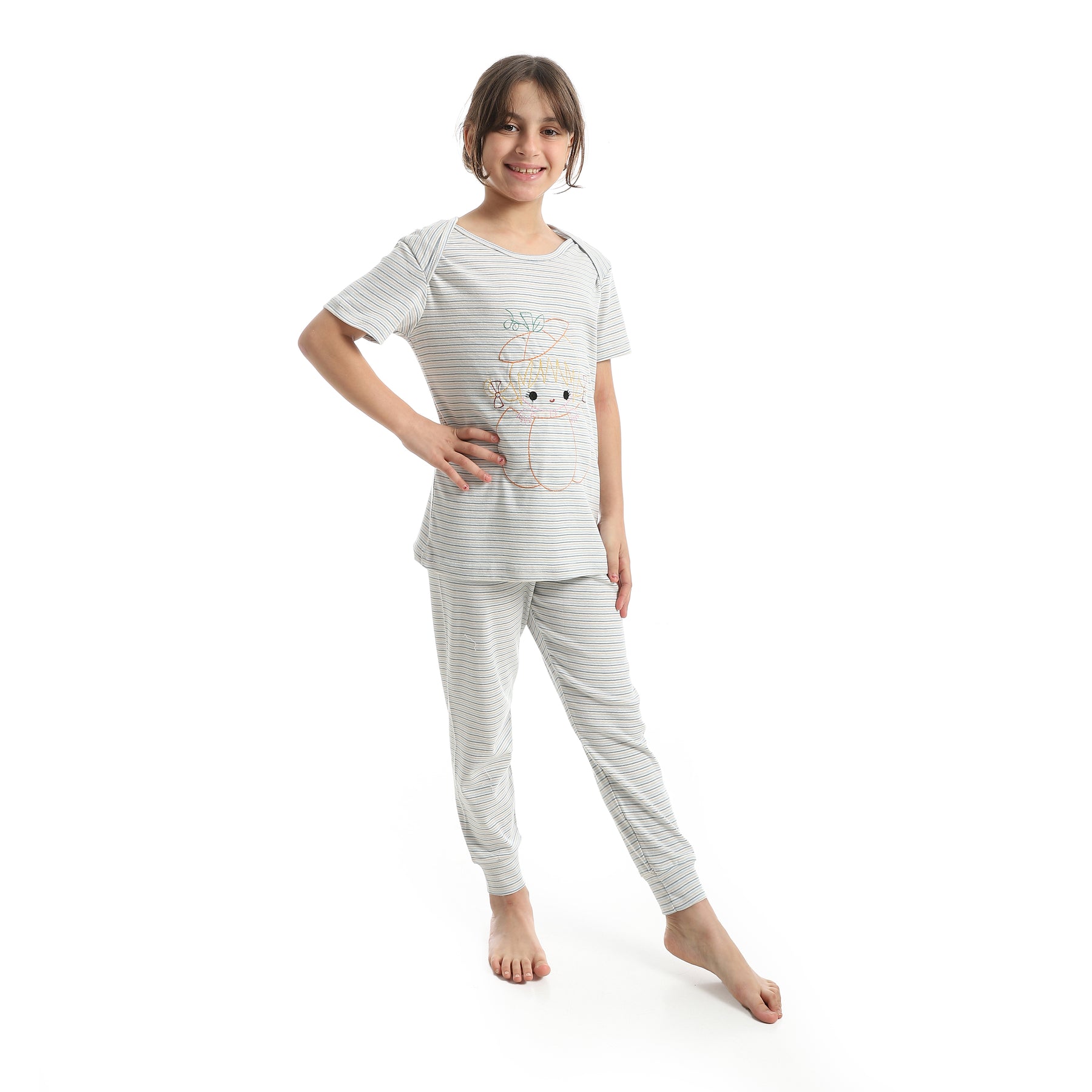 Girls' summer pajamas with a striped design and embroidery on the chest